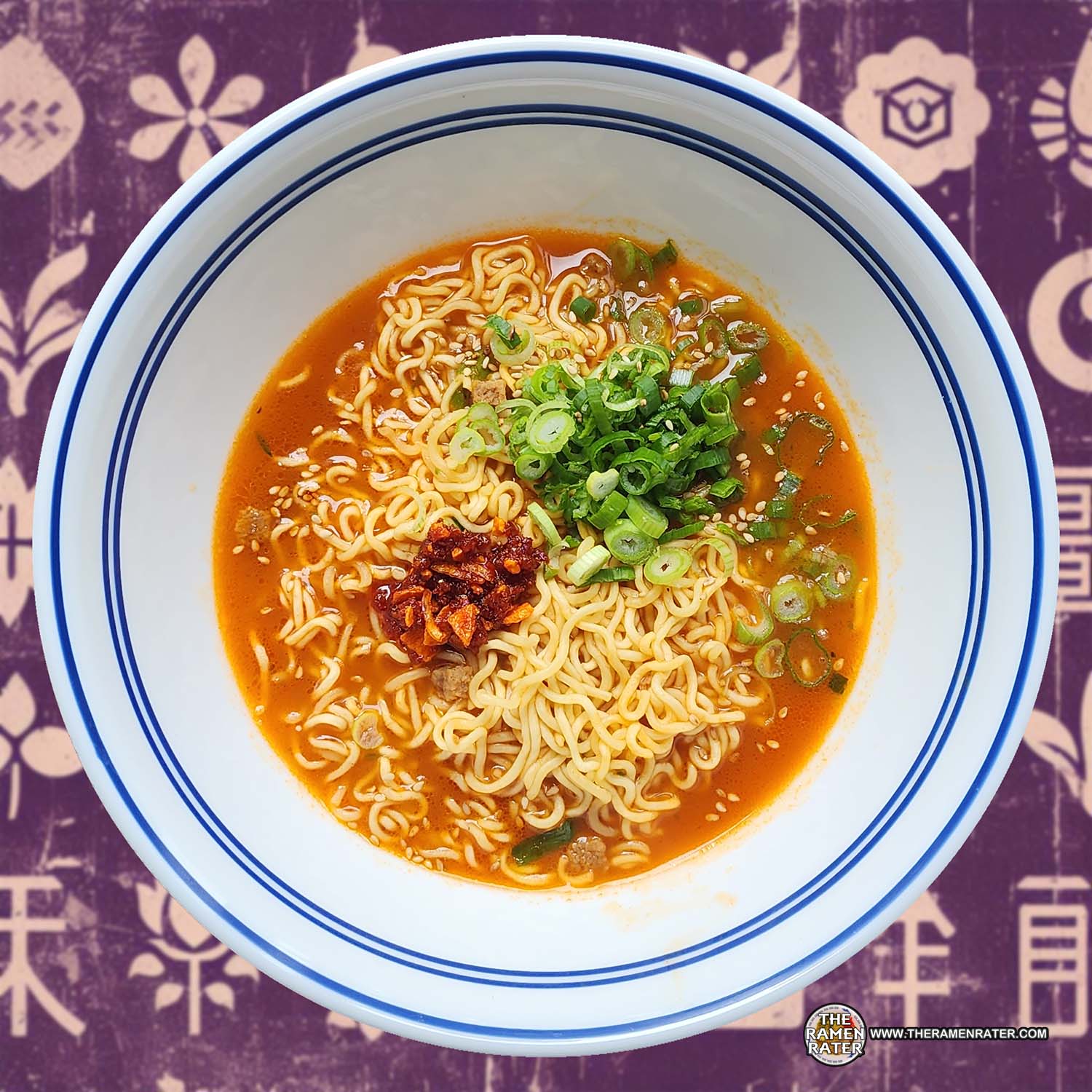Finished (click to enlarge). Added scallion, S&B Umami Topping Crunchy Garlic In Chili Oil, and sesame seed. This was very ‘as expected,’ which isn’t good for this one. The noodle was fine. The broth had scattered meaty bits. The broth was oily and had a kind of sweet, spicy, and buttery aspect. It just kind of mushed together into this funky taste that was neither here or there and never coalesced into something reasonable to push out as a product. 1.5 out of 5.0 stars. JAN bar code 4902881457903.