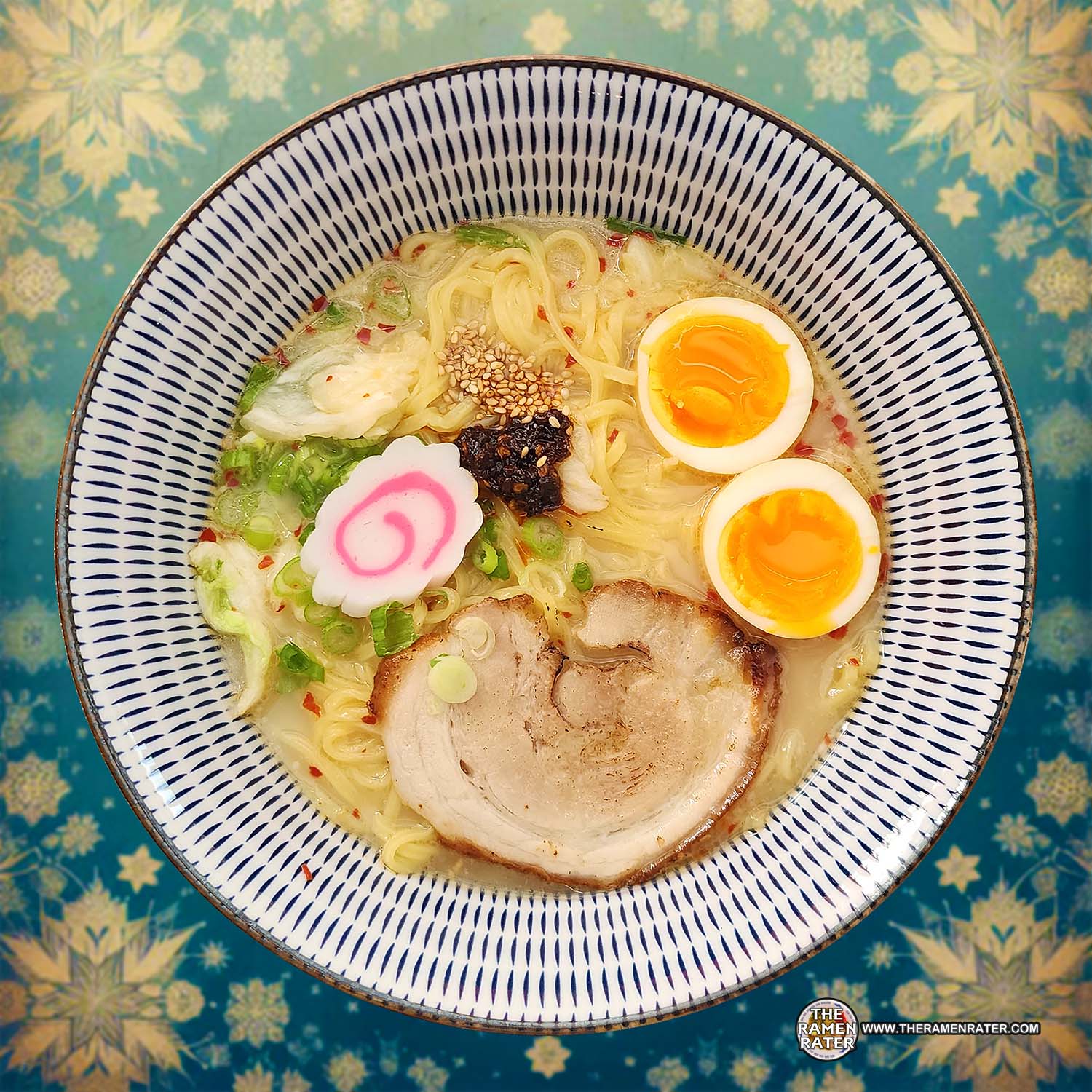 Finished (click to enlarge). Added chashu, egg, scallion, LKK Chiu Chow chili crisp in oil, narutomaki and sesame seed. Noodle has a very sturdy tooth and works well. This is a very rich shio; very strong broth with a little heat to it – and then the cabbage. Ruthless! Freeze dried cabbage springs to life from the freeze dried block and rounds everything out so nicely. 5.0 out of 5.0 stars. JAN bar code 4903088017600.