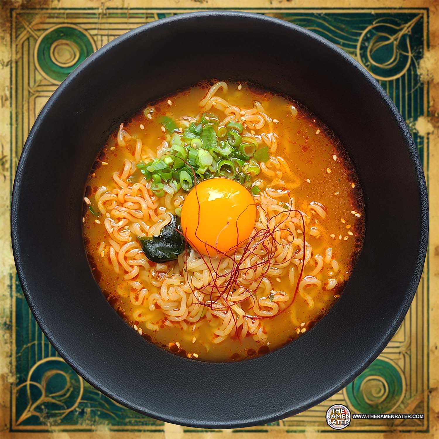 Finished (click to enlarge). Added egg, pepper thread, sesame seed, and scallion. Noodle has perfect ramyun thickness, gauge, and chew. Broth has a nice amount of heat and a little oiliness – and it has a definite squid flavor. It was difficult to track them down, but there was squid in there and seaweed as well. A very nice Korean variety that delivers great flavor. 4.5 out of 5.0 stars. EAN bar code 8809778497256.