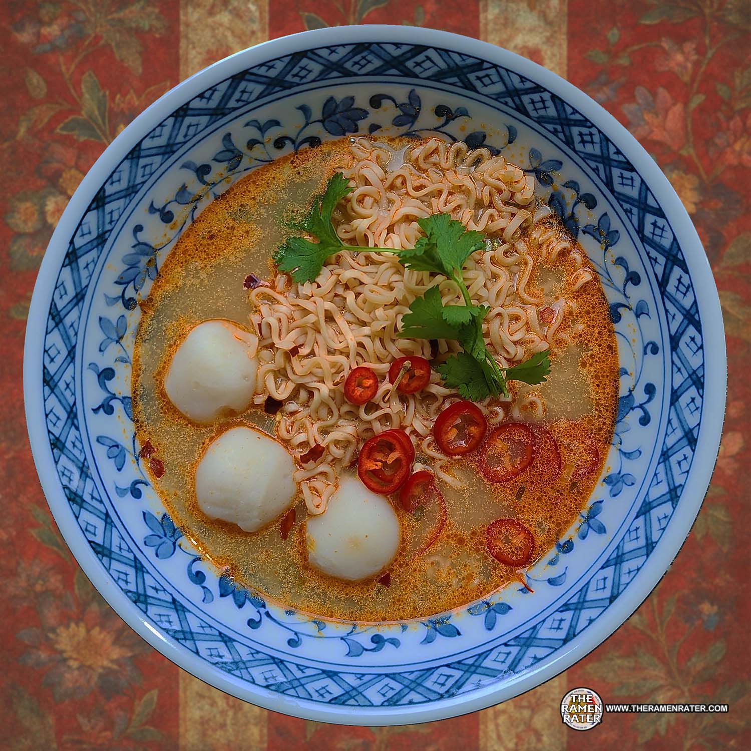 Finished (click to enlarge). Added Dodo fish ball, Fresno chili pepper, coriander, and crushed red pepper. Noodle is perfect – thin and brittle with a nice tooth. The broth bring a lemongrass, a chili, and a savory shrimp taste. As good as I remember. 5.0 out of 5.0 stars. EAN bar code 052066002054.