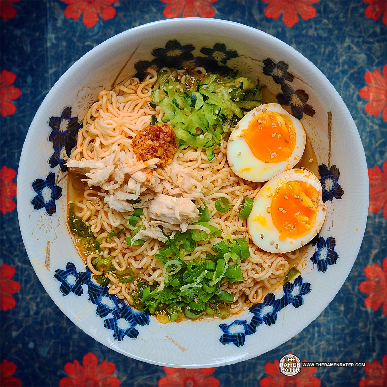 Finished (click to enlarge). Added scallion, shredded chicken, shredded cucumber, chili crisp, and sesame seed. Noodle is very light and fluffy. Soup is alright; not a premium, but a bright red ramyun broth. I like it to a degree. 3.75 out of 5.0 stars. UPC bar code 850068015016.