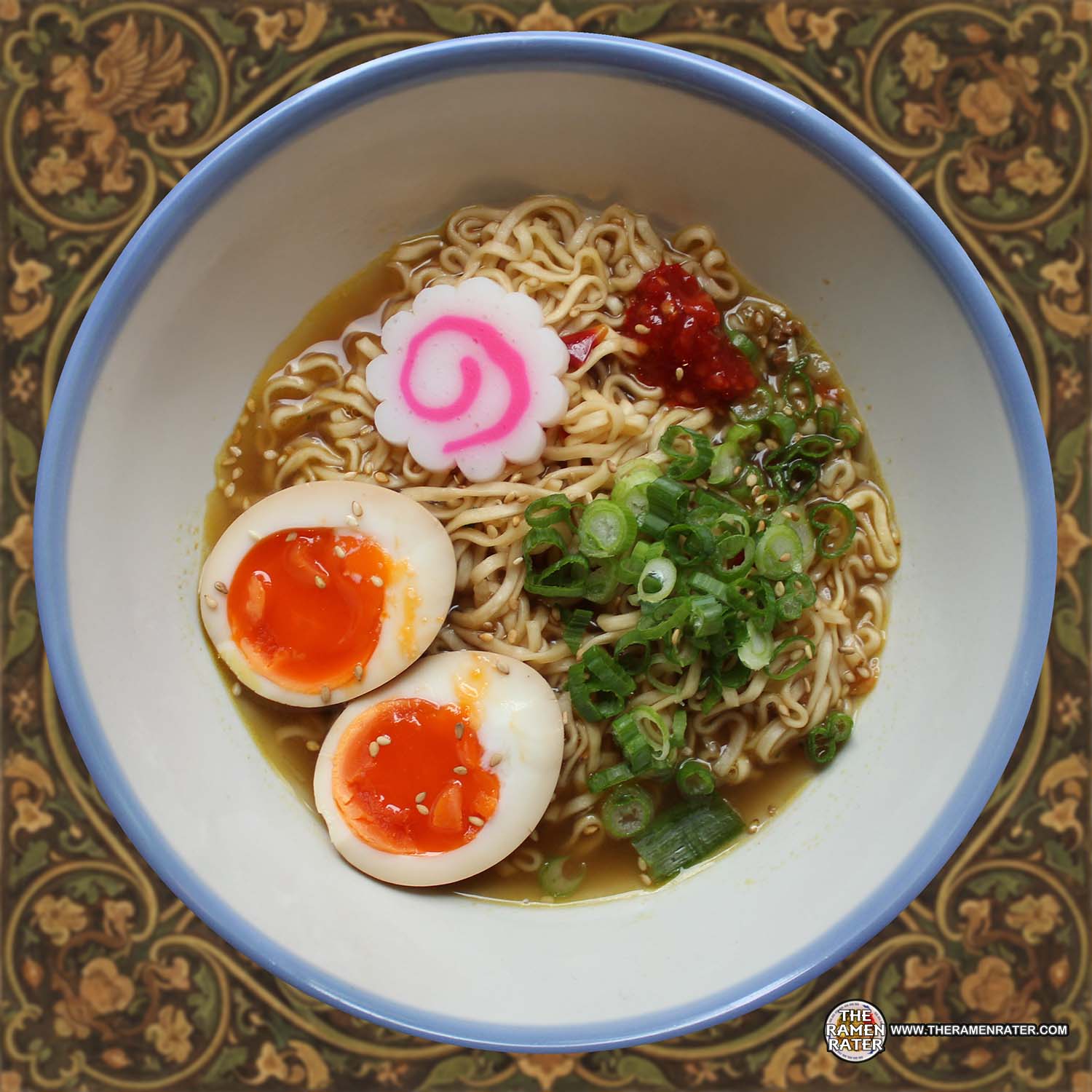 Finished (click to enlarge). Added LKK chili garlic sauce, egg, scallion, sesame seed, and narutomaki. Noodles came out fine after 3 minutes. Flavor was definitely mainly sweet onion which was nice, back with a bit or the herbal duck seasoning notes. Pretty good. 3.5 out of 5.0 stars. EAN bar code 5997523313333.