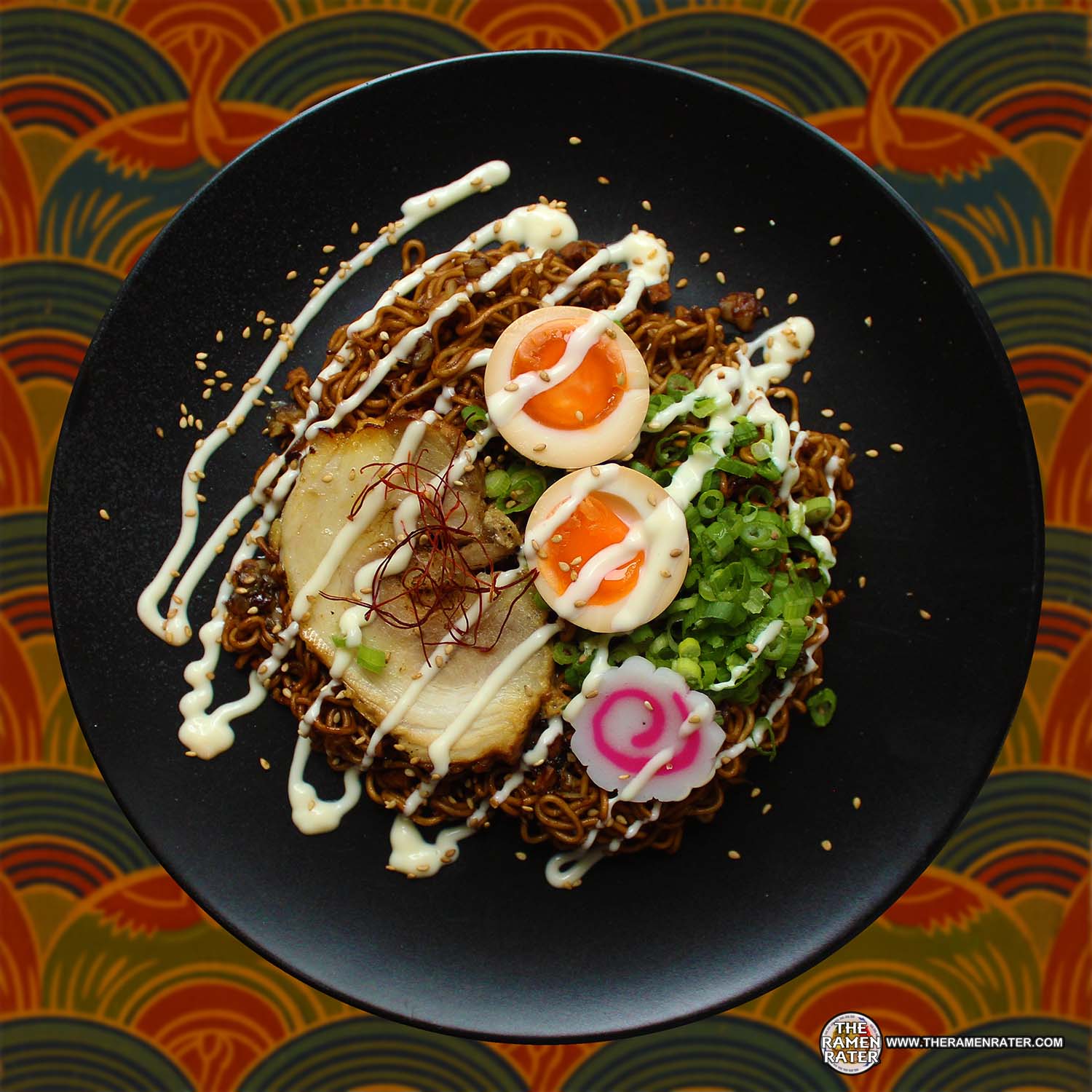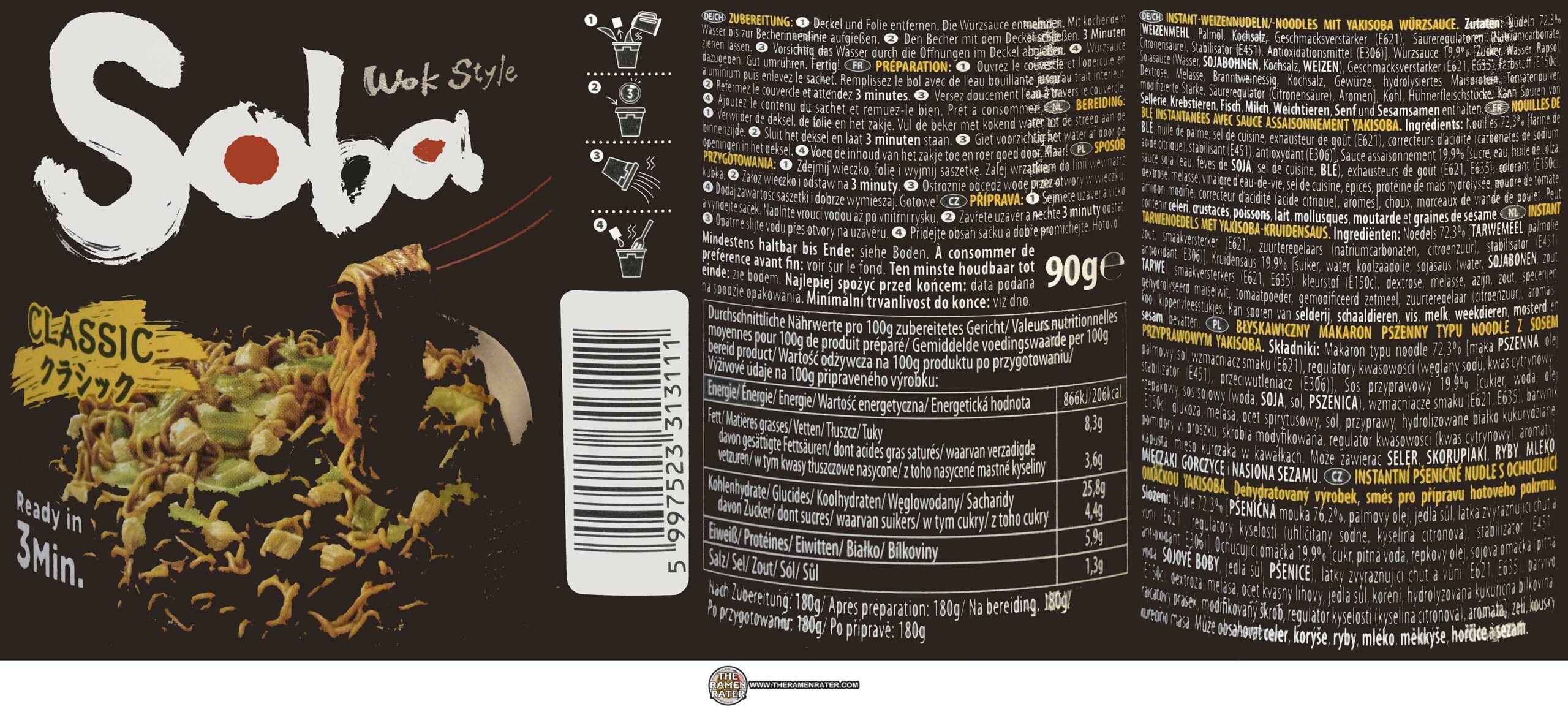 Finished (click to enlarge). Added narutomaki, scallion, chashu, egg, mayonnaise, pepper thread, and sesame seed. Noodle is standard gauge with soft tooth. The sauce is standard yakisoba sauce – tangy with tamarind notes. Lots of veg in it as well. Yep – a very nice yakisoba. 5.0 out of 5.0 stars. EAN bar code 5997523313111.