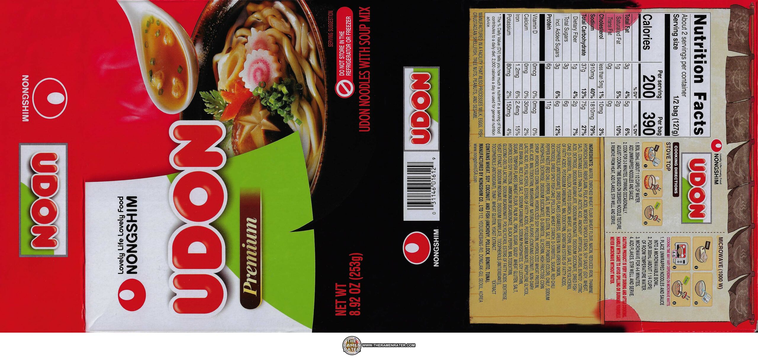 Finished (click to enlarge). Added kamaboko, crushed red pepper, scallion, and sesame seed. Udon is really one of the best out there. The broth is a balance of sweet and salty with fish notes from bonito and hint of smokiness. Garnish was on point; varied and tasty with a little texture to boot. 4.25 out of 5.0 stars. UPC bar code 031146016129.