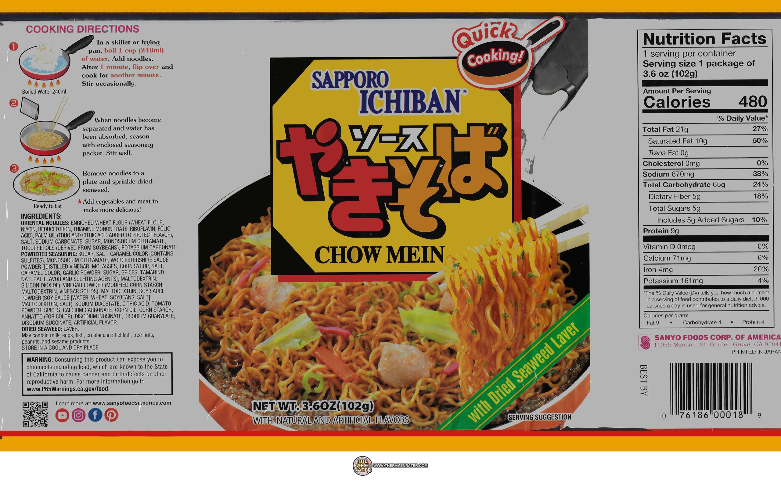 Finished (click to enlarge). Added fried egg, sesame seed, and chashu. Noodle came out great – nice gauge. The flavor is a sweet and Worcestershire taste; not sharp like yakisoba but a little tanginess there. Really love this still and highly recommend. 5.0 out of 5.0 stars. UPC bar code 076186000189.