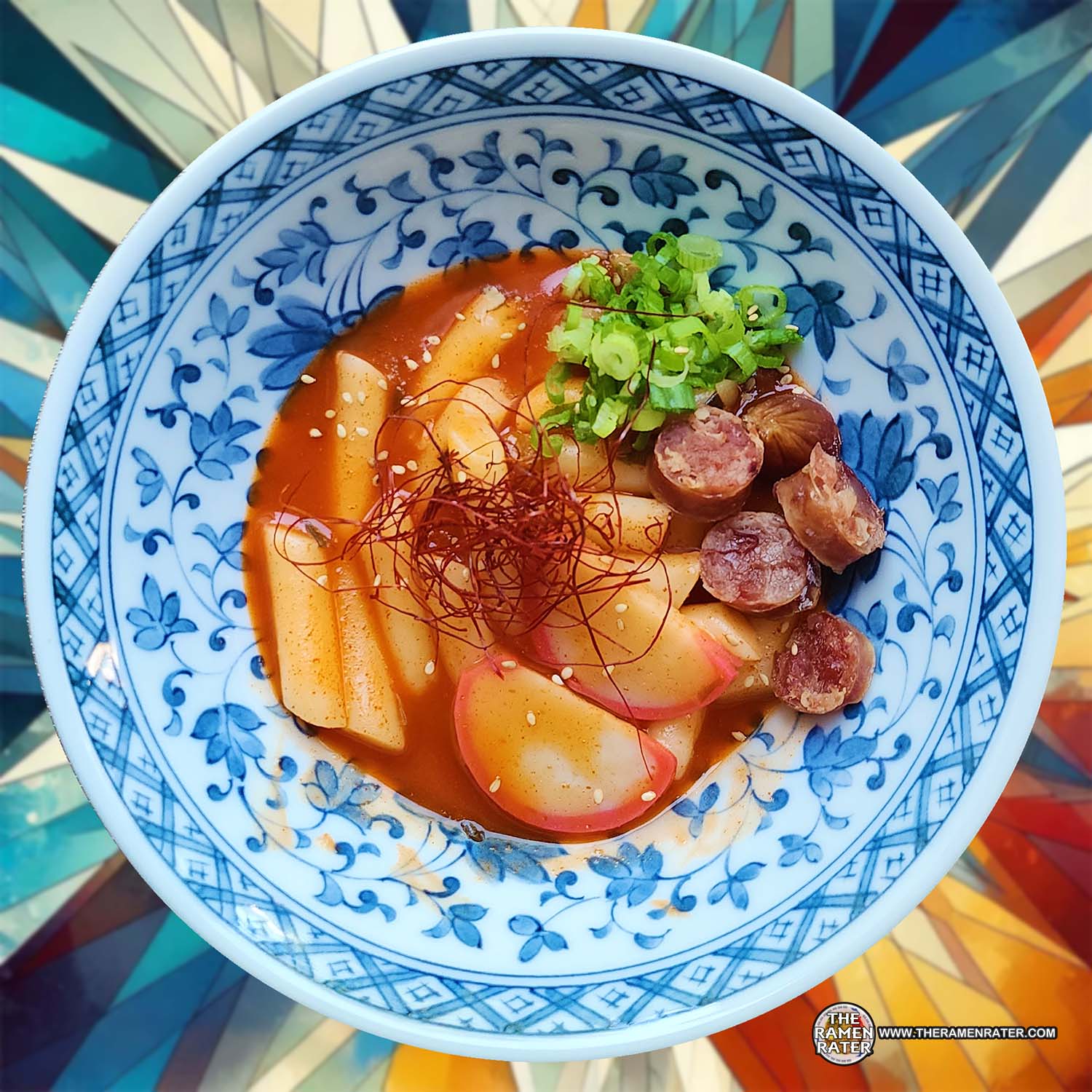 Finished (click to enlarge). Added pepper thread, kamaboko, Chinese sausage, scallion, and sesame seed. Tteokbokki came out perfectly per instructions. The sauce is spicy and sweet with a little tanginess – as it should be. Nice little bit of veg in there. Not ramen, but wonderful. 4.5 out of 5.0 stars. EAN bar code 8809950200582.