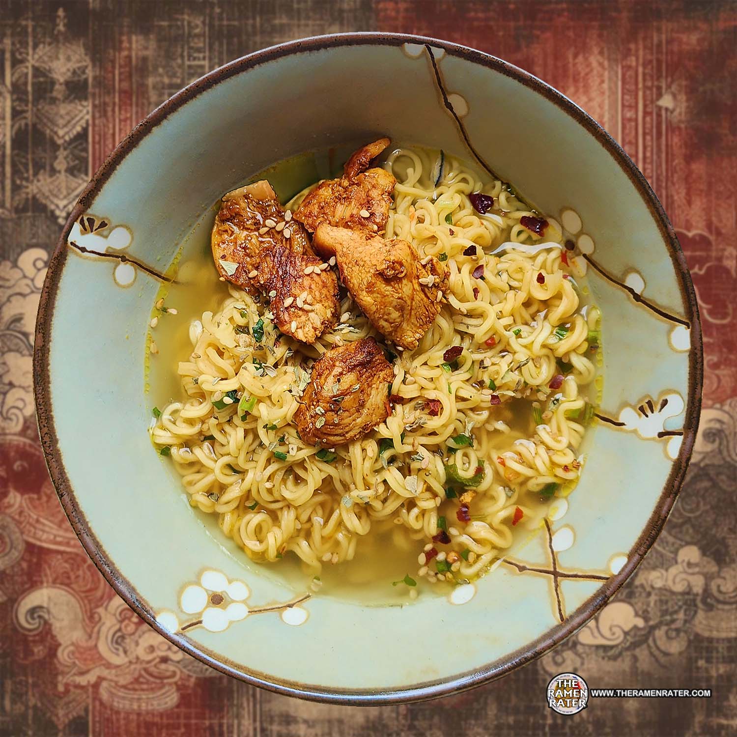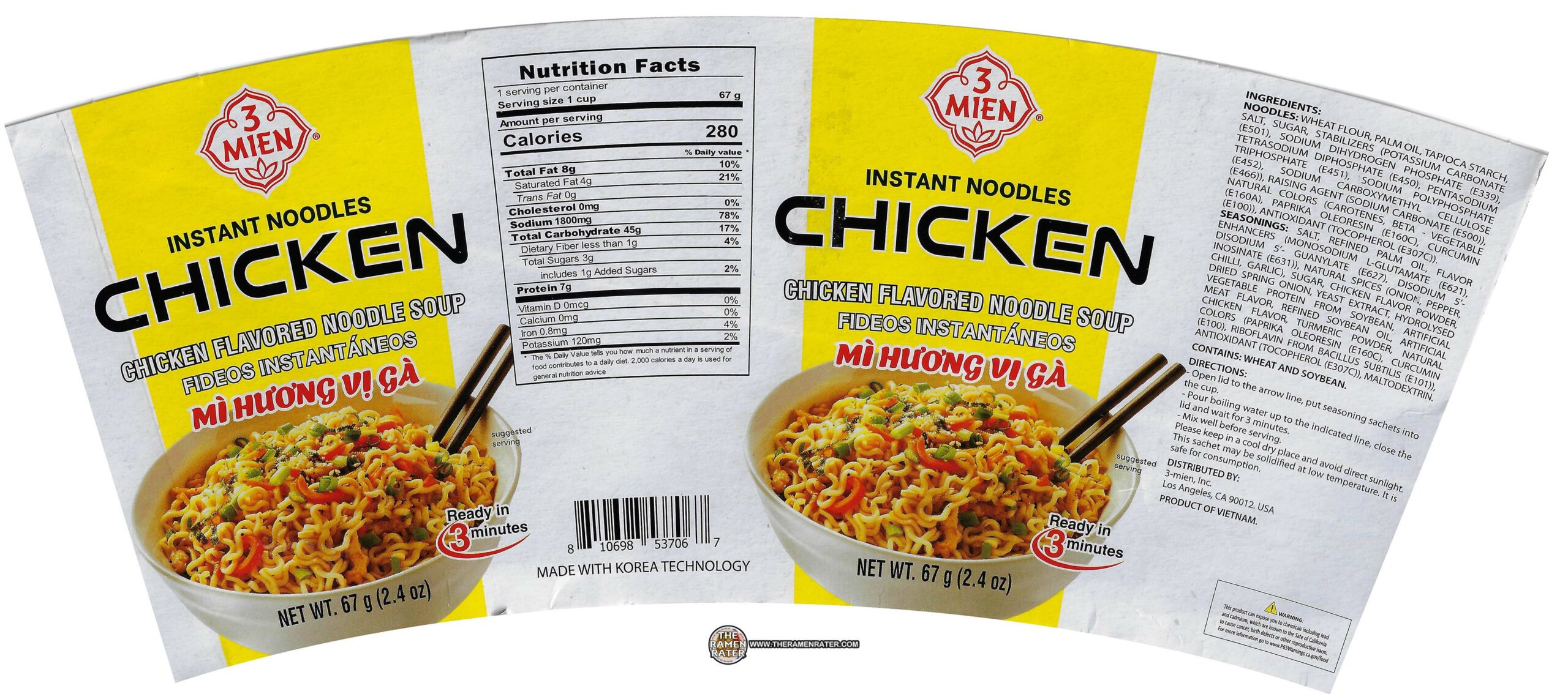 Finished (click to enlarge). Added basil and chicken. Noodle hydrated pretty well despite worries on the stir. Noodle reminds me of a Thai variety although it’s made in Vietnam with ‘Korea technology. ‘The broth is indeed a tasty chicken flavor and worked well. A decent chicken cup. 3.5 out of 5.0 stars. UPC bar code 810698537067.