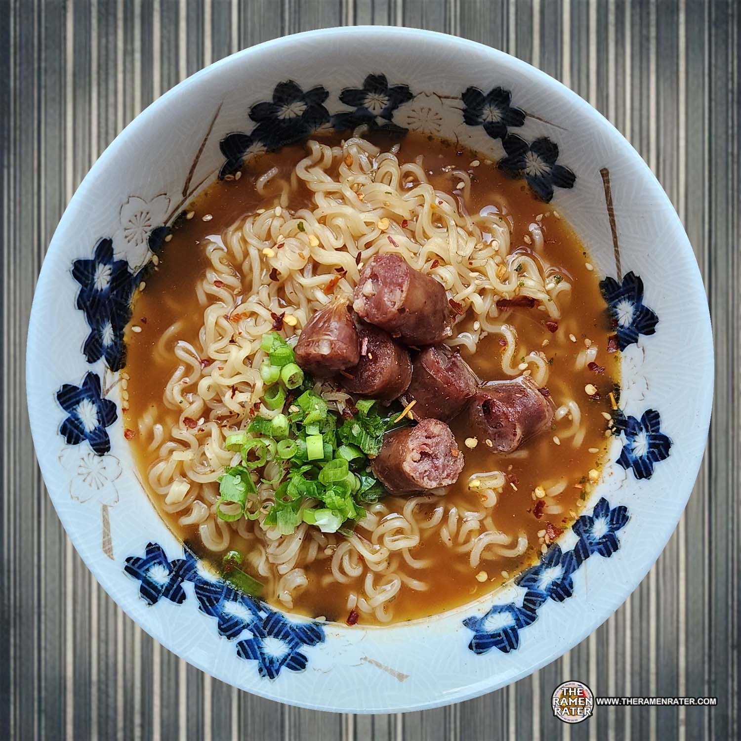 Finished (click to enlarge). Added Chinese sausage, scallion, crushed red pepper, and sesame seed. Noodle is your standard Top Ramen type – pretty good. The broth had a nice bump of heat and a nice beef flavor. Honestly, quite good. 3.75 out of 5.0 stars. UPC bar code 070662016121.