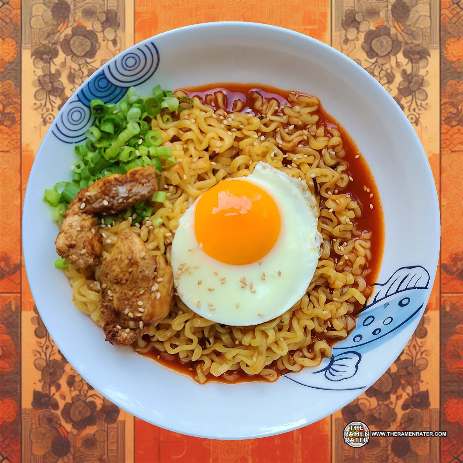 Finished (click to enlarge). Added chicken, egg, scallion, and sesame seed. Noodle is great – thick and nice tooth. The heat is spicy – very much so. The taste is not at all what I would consider chicken or curry. It’s not bad, but it’s just kind of there and doesn’t speak to me. 3.0 out of 5.0 stars. UPC bar code 648436101283.