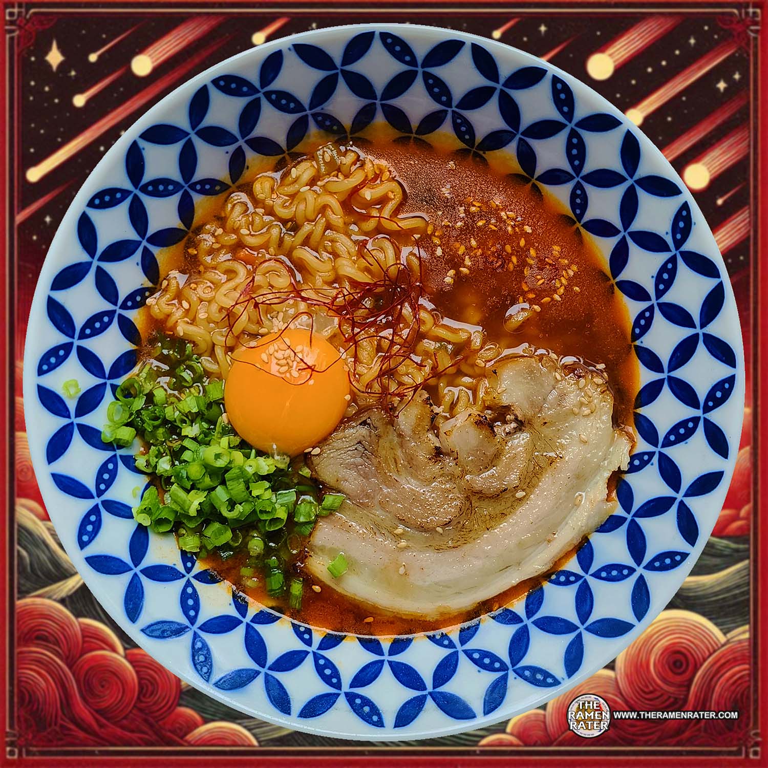 Finished (click to enlarge). Added chashu, egg, scallion, pepper thread, and sesame seed. Noodle is sturdy and a nice chew – very nice. The broth is a very standard spicy beef with a nice back to it with minimal bitterness. Quite good. 4.0 out of 5.0 stars. UPC bar code 846034055681.