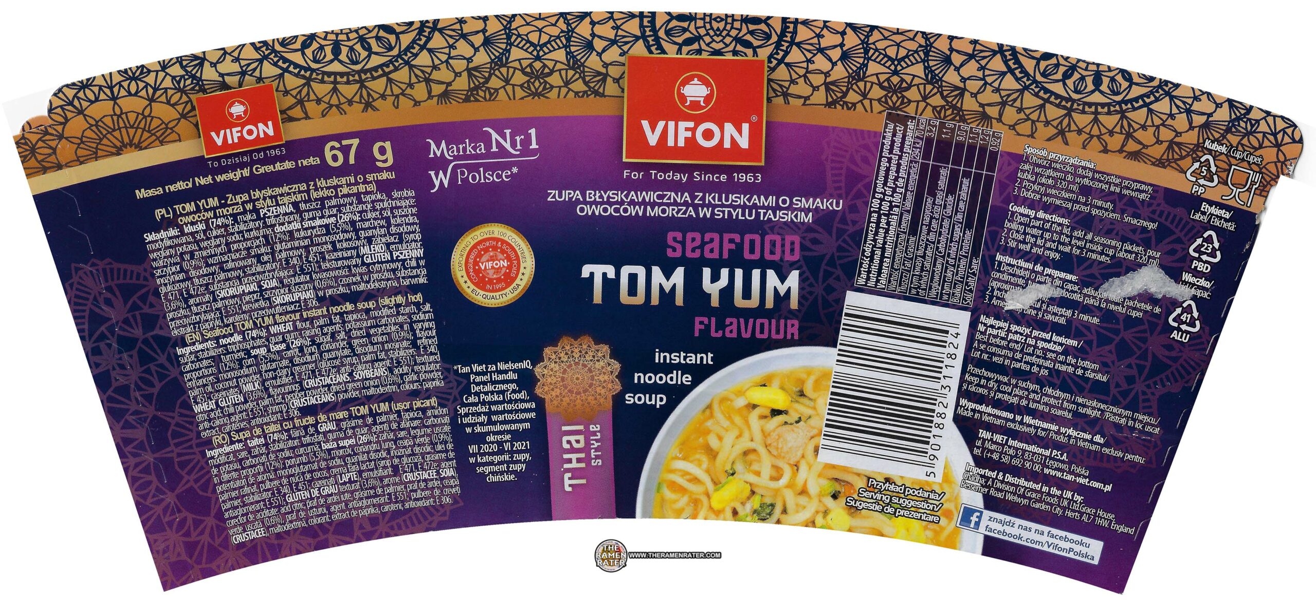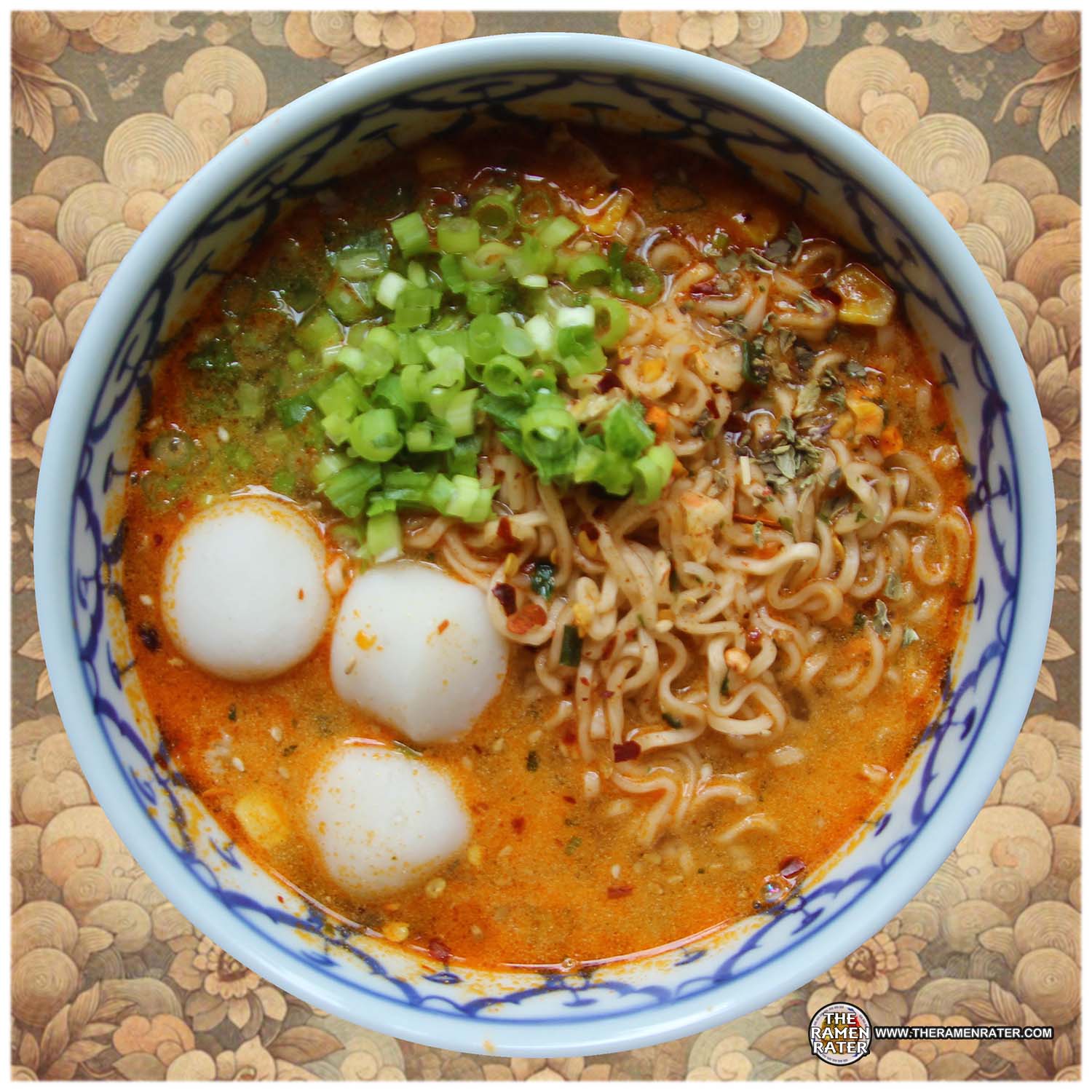 Finished (click to enlarge). Added fishball, scallion, basil, and crushed red pepper. Noodle is spot on; I would guess it was a Thai style instant witithout the label. The broth is certainly tom yum – the heat, the seafood, the lemongrass – works very well and surprisingly all the corn in there works well as some crisp gives it a nice fresh sense. 4.25 out of 5.0 stars. EAN bar code 5901882311824.