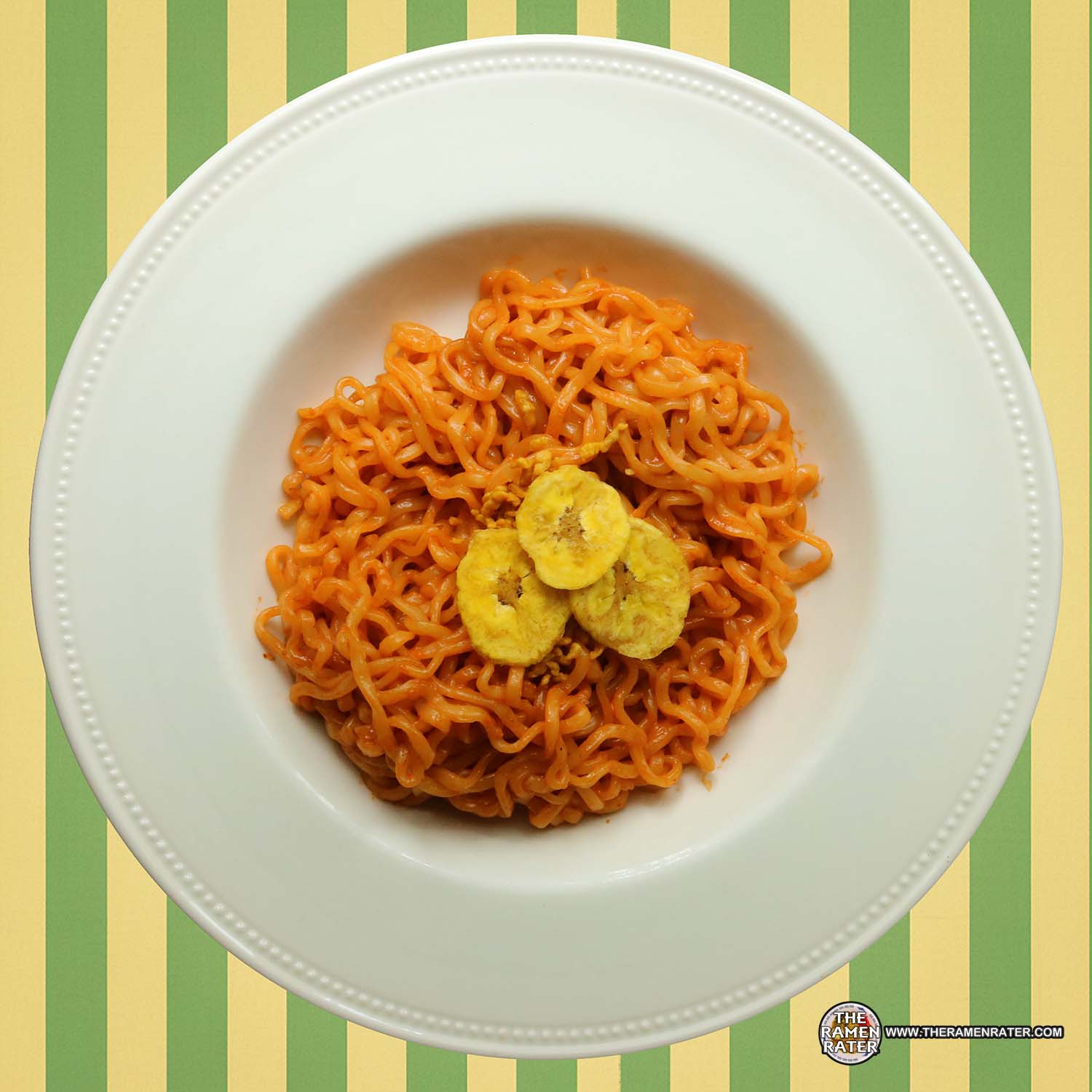 Finished (click to enlarge). Added fried plantain chips. The noodle was really quite nice – thick and chewy. The flavor certainly was as expected; that Laffy Taffy, bubble tea banana sugary sweetness that kind of tastes like banana in a confectionary sense, much in the way watermelon bubblegum doesn’t really taste exactly like watermelon, although it’s watermelon flavor if that makes sense. The heat level was about a third of the original Buldak. The flavor of Buldak sauce and the banana really worked decently together. This doesn’t seem like a daily driver for most though, and definitely a unique novelty. That being said, it couldve been done much worse and it is palatable. 3.75 out of 5.0 stars. EAN bar code 8801073116948.