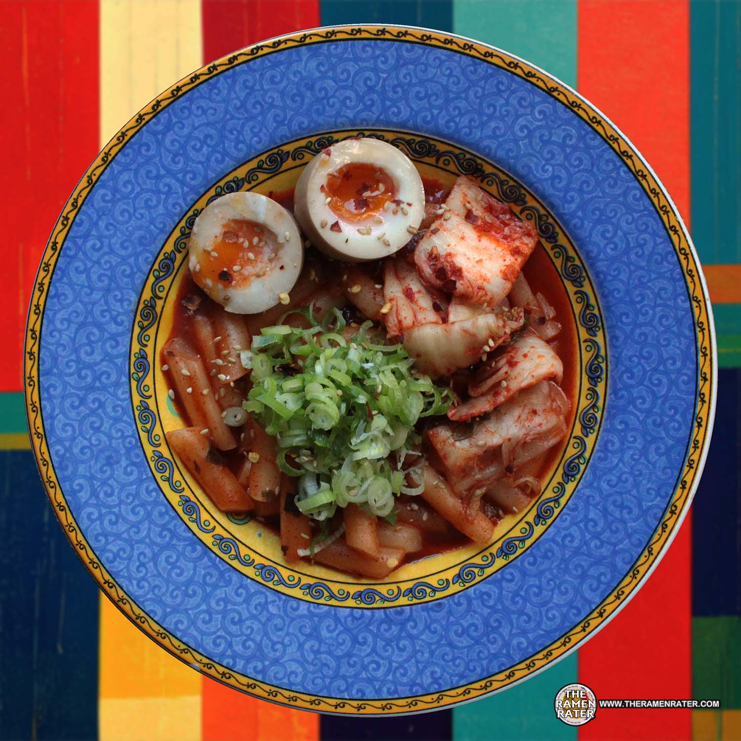 Finished (click to enlarge). Added scallion, crushed red pepper, sesame seed, and kimchi. Perfect tteokbokki right out of the 90 second spin in the microwave. Sauce is just right – sweet, spicy, tangy – and augmented with veg and little fishcake pieces. Loved it. 5.0 out of 5.0 stars. EAN bar code 8809151140298.