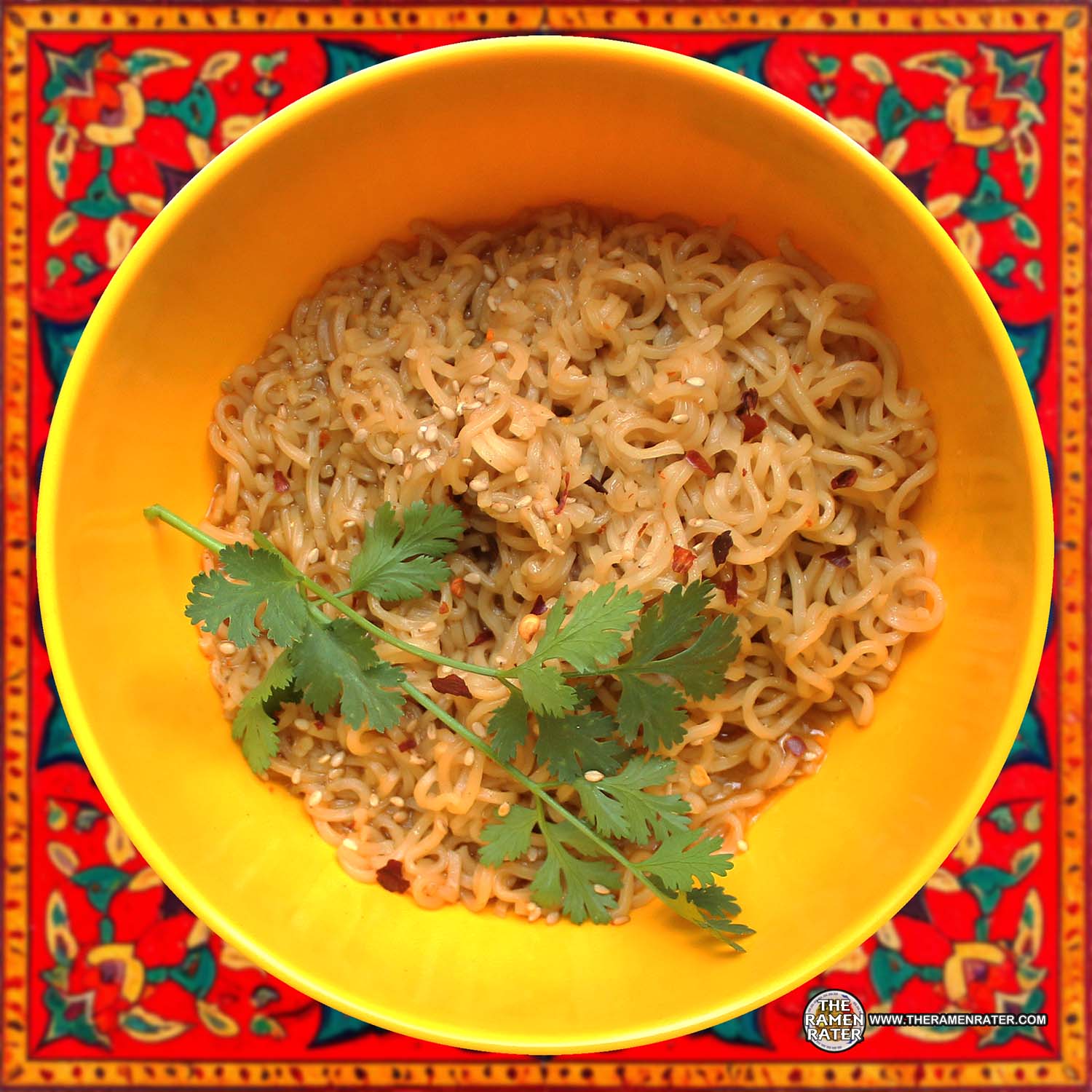 Finished (click to enlarge). Added crushed red pepper and coriander. Noodle came out nicely. I like the broth which has a spicy bite to it and very good curry masala flavor – very rich. Niceness! 3.75 out of 5.0 stars. EAN bar code 8901741000255.