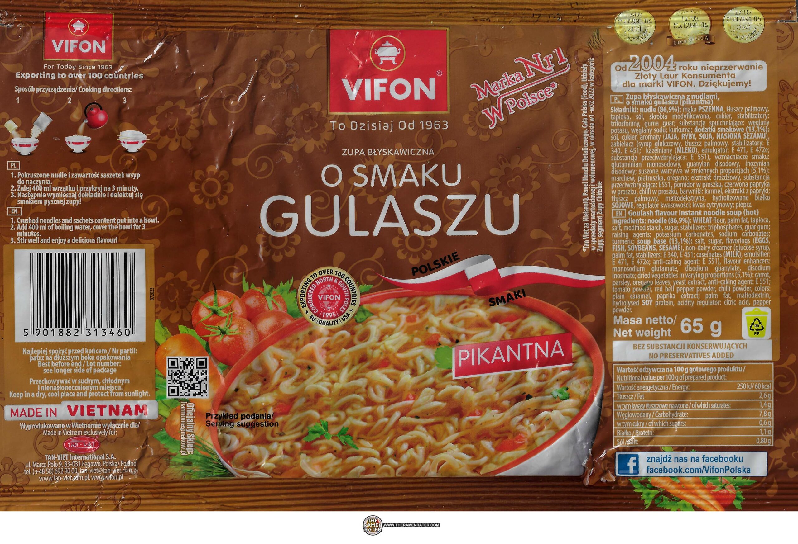 Finished (click to enlarge). Added pork and scallion. Noodle is thin with a light crumble, standard Vietnamese instant. The broth has a kind of neither here nor there flavor that dances around being really strong which I wish it were. Also, this should be a bit thicker as is the Polish style of goulash. I think cooking it down on the stove would work much better. 2.0 out of 5.0 stars. EAN bar code 5901882313460.