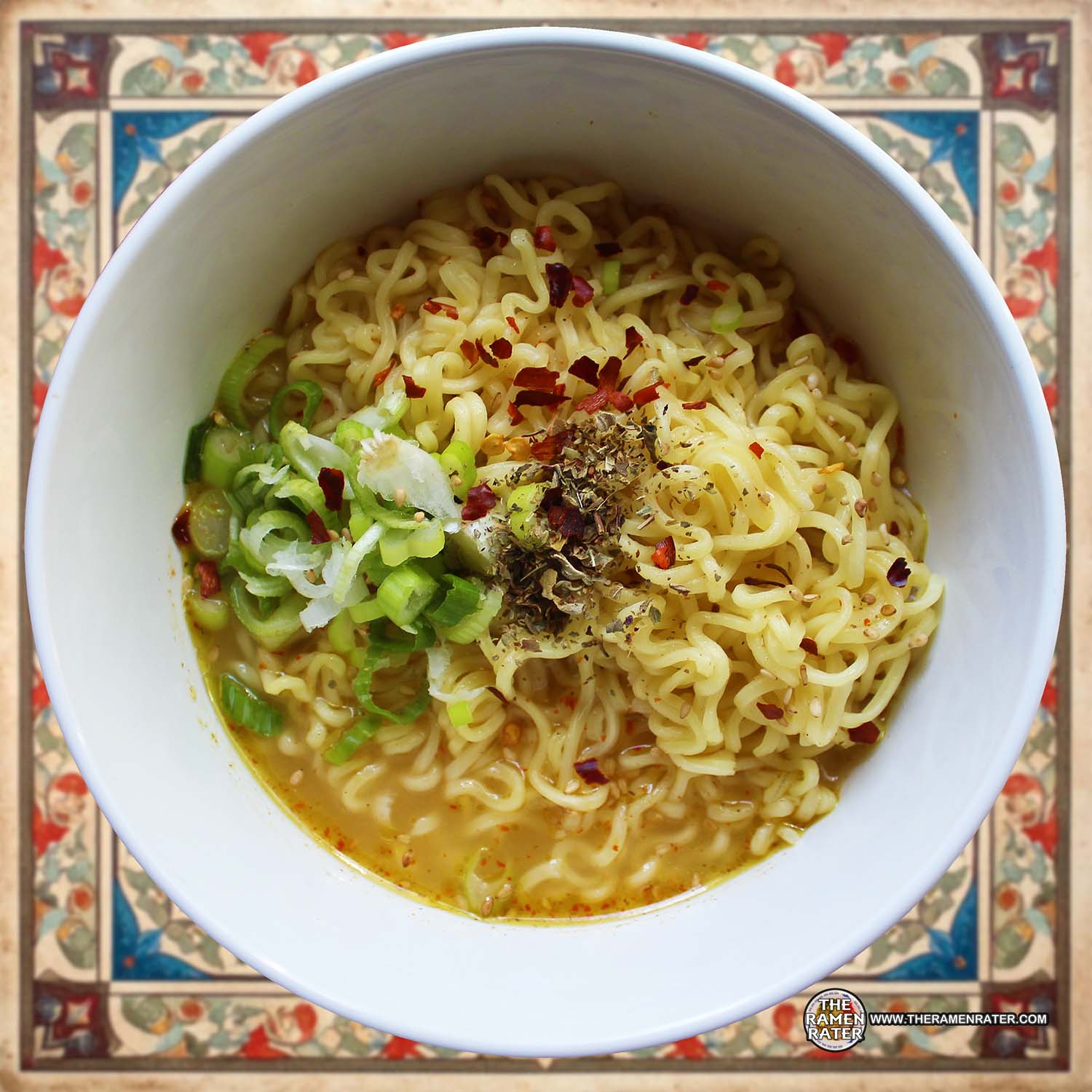 Finished (click to enlarge). Added scallion, crushed red pepper, sesame seed, and basil. Noodle is quite good – thick and lightly chewy. The broth is very strong on saltiness with a nice buttery vegetable kind of flavor. 3.75 out of 5.0 stars. EAN bar code 8680908020328.