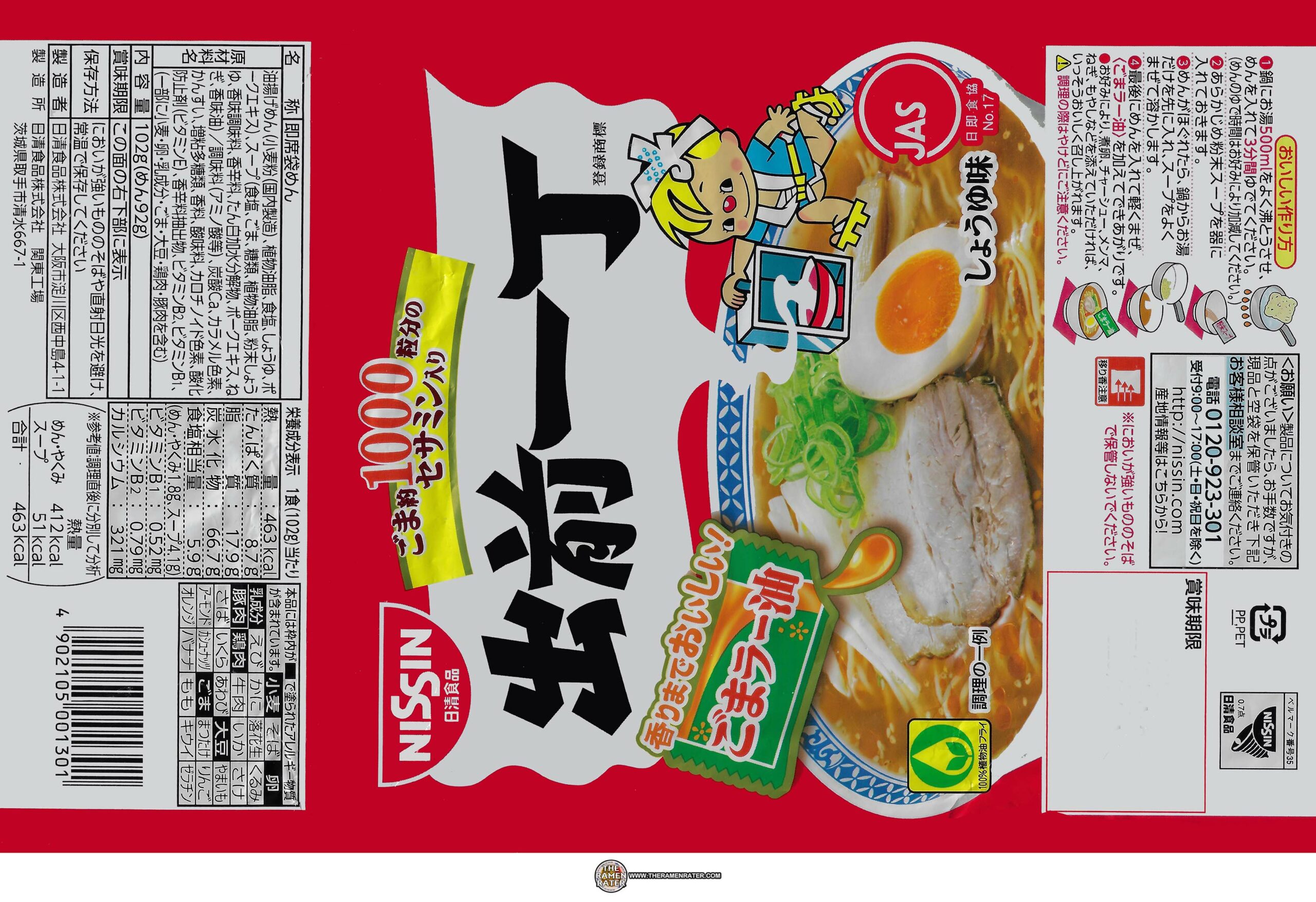 Finished (click to enlarge). Added narutomaki, chashu, egg, scallion, and sesame seed. The noodle is most certainly different – and better. It’s got more chew than the standard variety I’ve tried. The broth is full and the sesame oil just makes it so sumptuous. Included sesame seed in the powder sachet – A+. Really loved this. 5.0 out of 5.0 stars. JAN bar code 4902105001301.